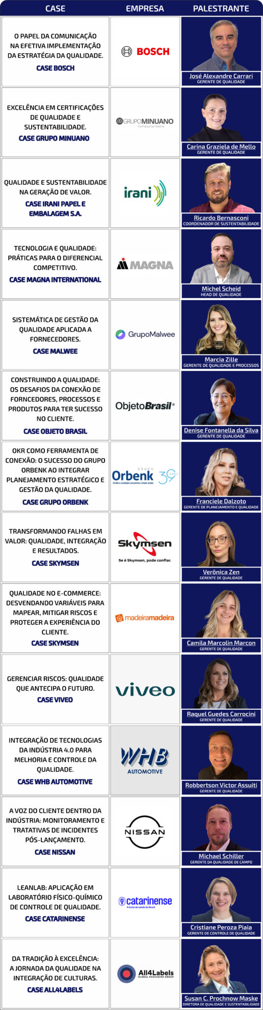 - Apresentações de cases finalistas de Excelência Operacional (Kaizen, TPM, Lean Manufacturing, WCM, Six Sigma e outras estratégias de gestão da qualidade e produtividade)